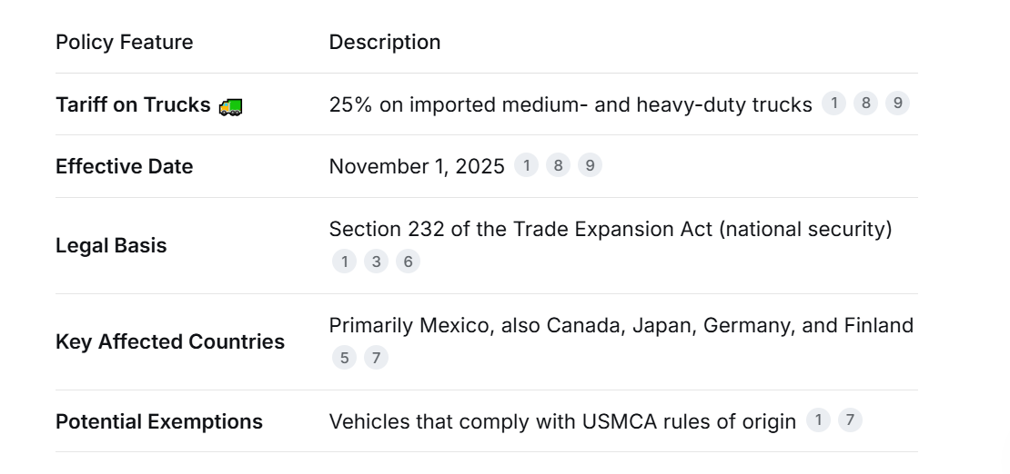 1.Politische Begründung: Dieser Tarif basiert auf einer im April 2025 eingeleiteten Untersuchung gemäß Abschnitt 232, die zu dem Schluss kam, dass die Abhängigkeit von importierten Lkw die nationale Sicherheit der USA und die inländische Logistikkette gefährdet. Ziel ist es, amerikanische Hersteller und Arbeitsplätze zu schützen.